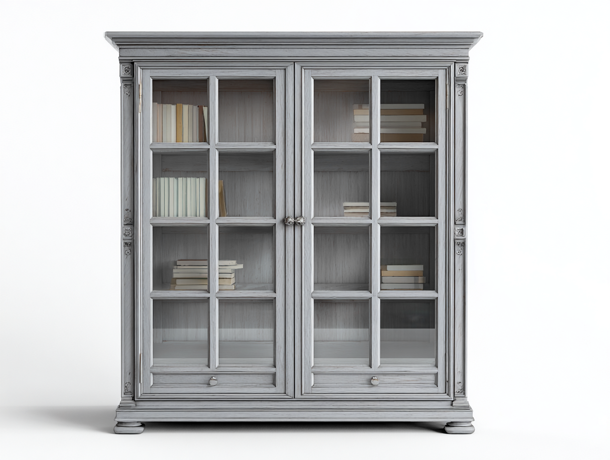 Dieser Bücherschrank vereint praktische Aufbewahrung mit einer dekorativen Präsentationsfläche und eignet sich ideal für Wohnzimmer oder Arbeitszimmer. Hinter den großen Glasfronten können Bücher oder dekorative Gegenstände übersichtlich platziert werden. Das klassische Design mit klaren Linien sorgt für eine harmonische Integration in verschiedene Wohnstile und unterstützt eine ordentliche Raumgestaltung.